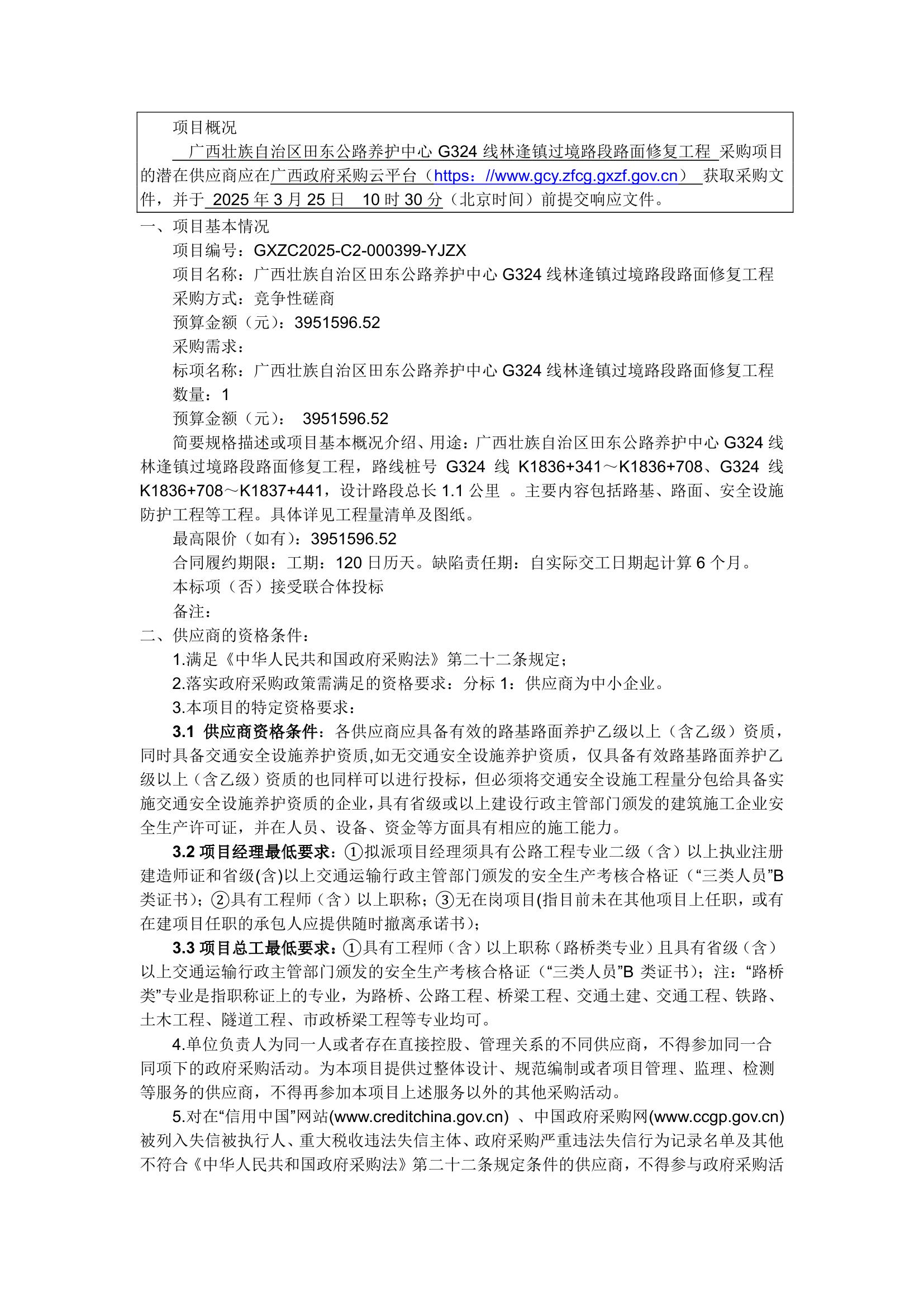 廣西(xī)壯族自(zì)治區(qū)田東(dōng)公路(lù)養護中心G324線林(lín)逢鎮過境路(lù)段路(lù)面修複工☆β÷≠(gōng)程 采購(gòu)項目的(de)潛在供應商應在廣西(xī)政府采購(gòu)雲平台(https://www.gcy.zfcg.gxzf.gov.cn) 獲取采購(gòu)文(wén)件(jiàn),并于 2025年(nián)3月(yuè)25日(rì) 10時(shí)30分(fēn)(北(běi)京時(shí)間(jiān))前提交響應文(wé§λ©σn)件(jiàn)。